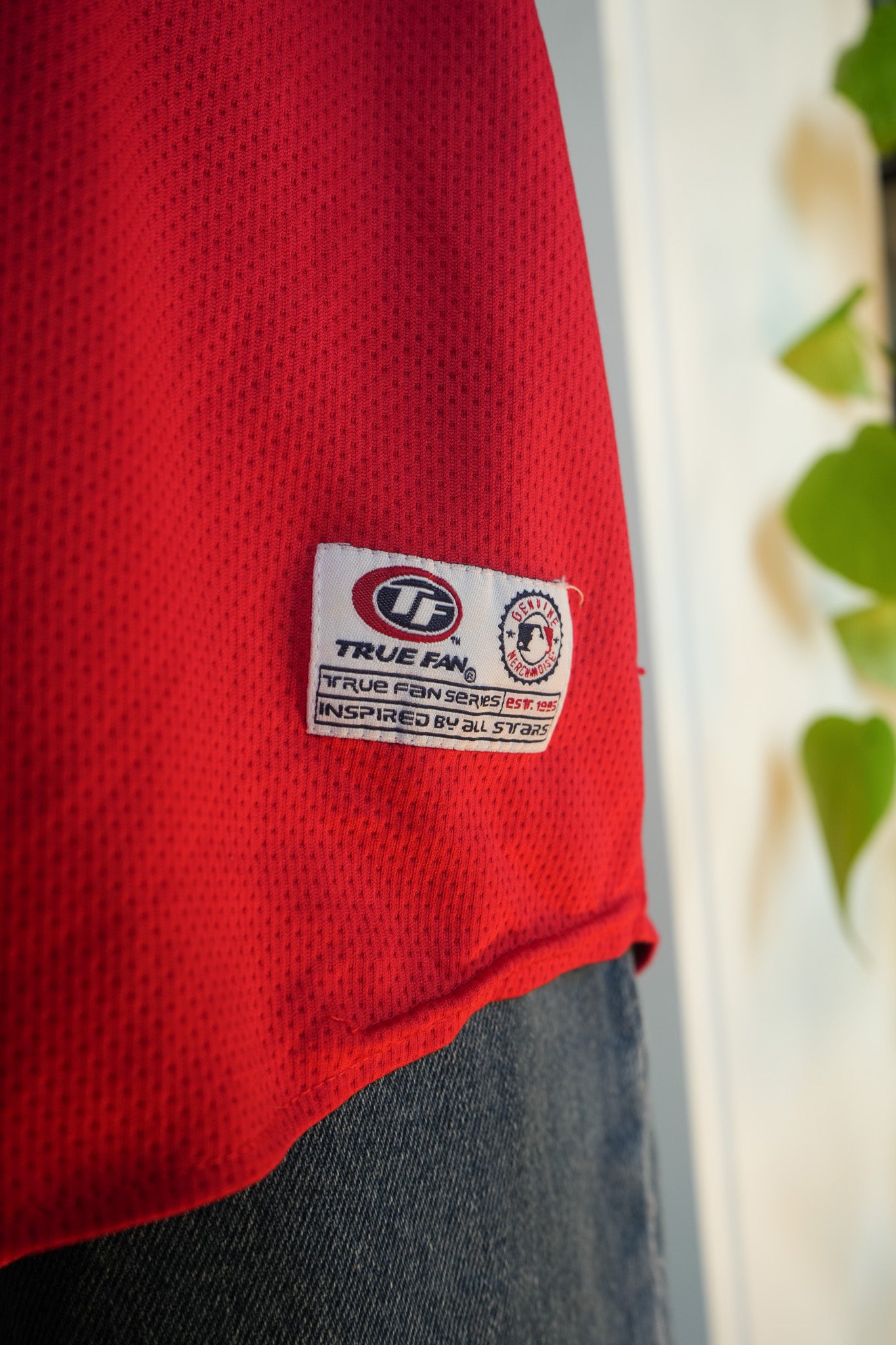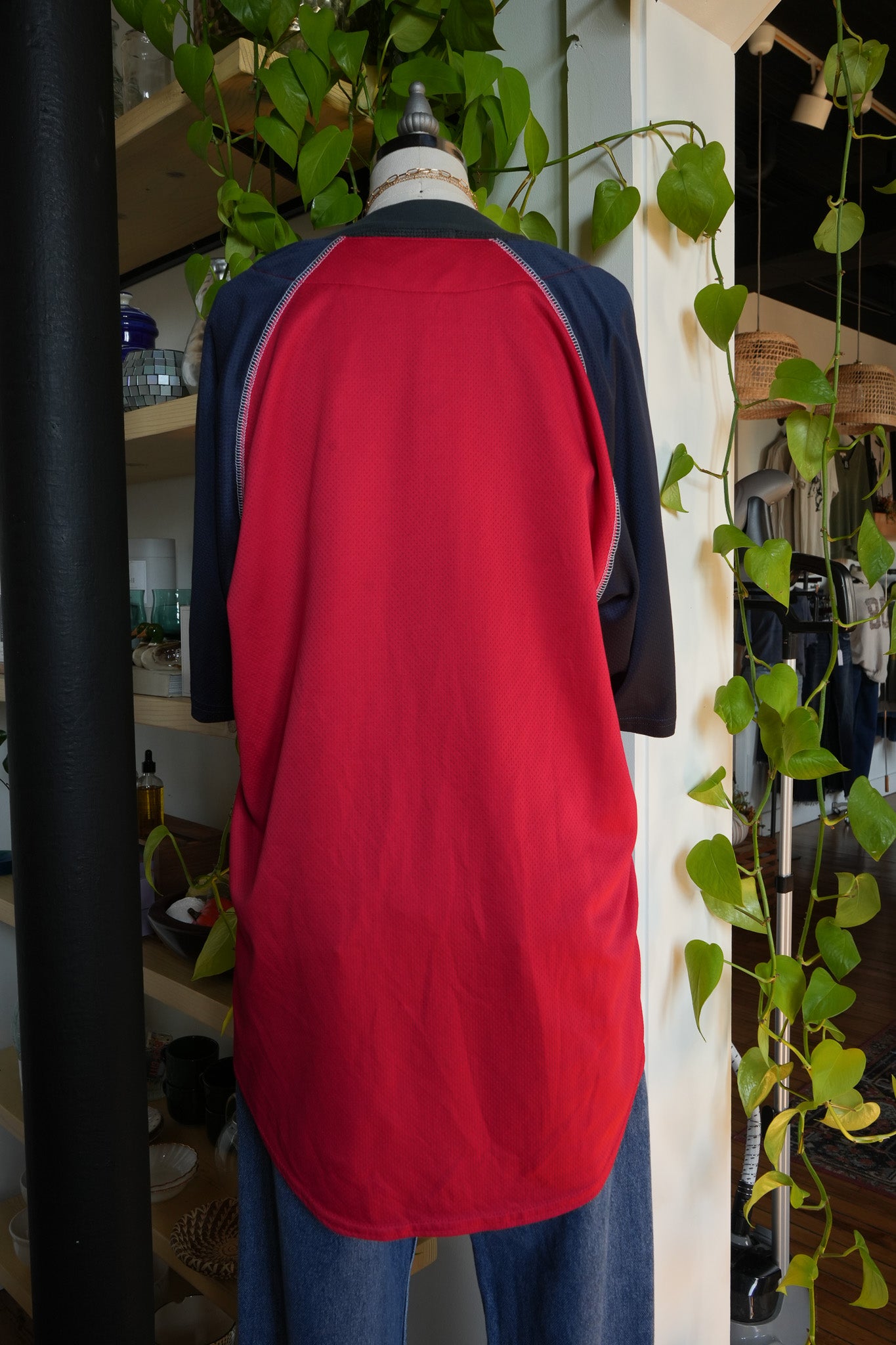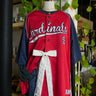 Rep the Cardinals in style with this XL red and blue button-up jersey, complete with a bow accent for a unique twist. Lightweight and breathable, it’s perfect for layering over your favorite tee or styling on its own. Undershirt not included.A versatile piece that brings team spirit with a fashionable edge.