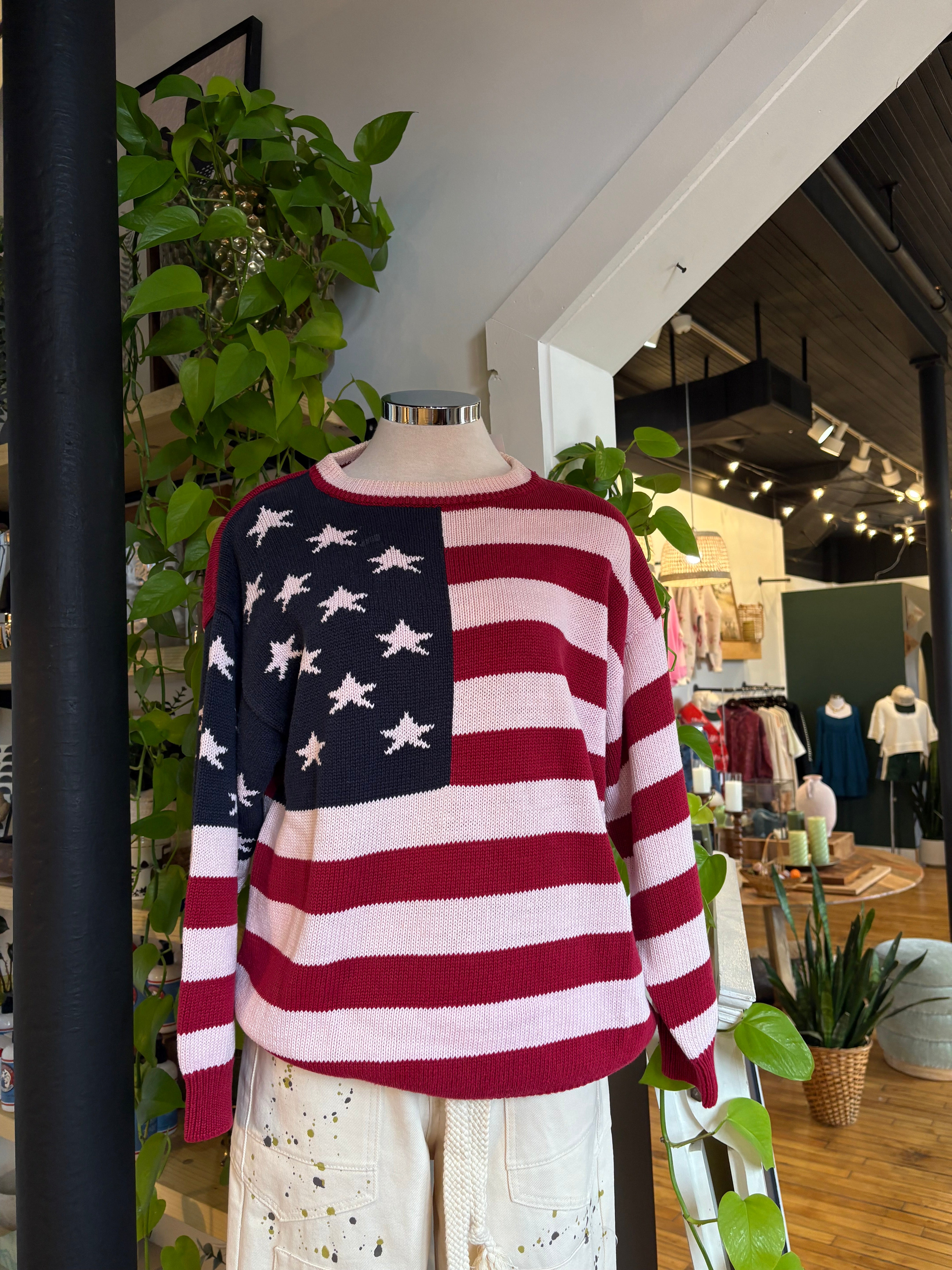 This patriotic oversized knit pullover sweater features a bold American flag design with stars on the navy sleeve/shoulder and classic red-and-white stripes across the body, in a cozy crewneck style that fits like a women’s large—perfect for 4th of July, Memorial Day, or casual patriotic vibes.