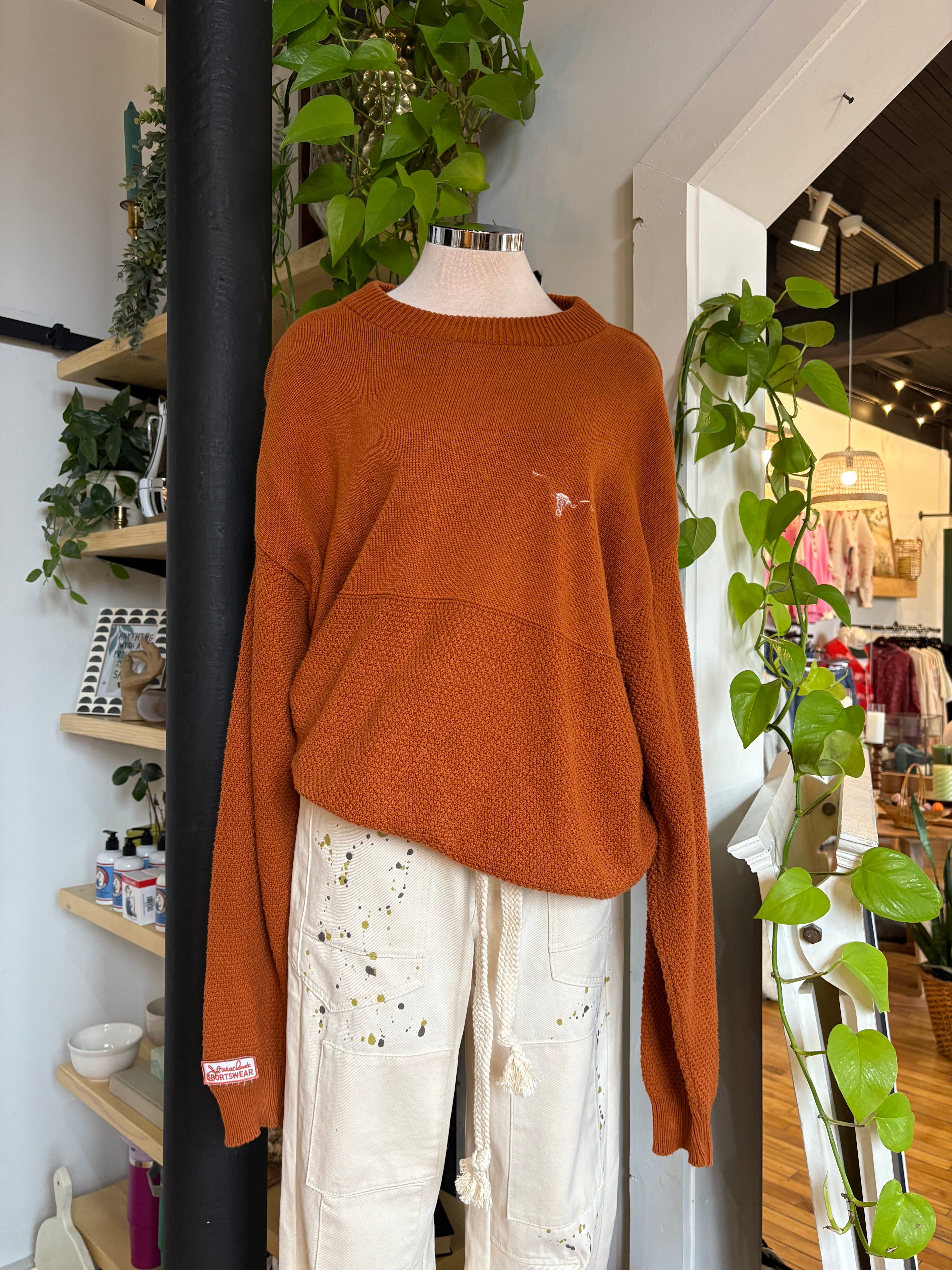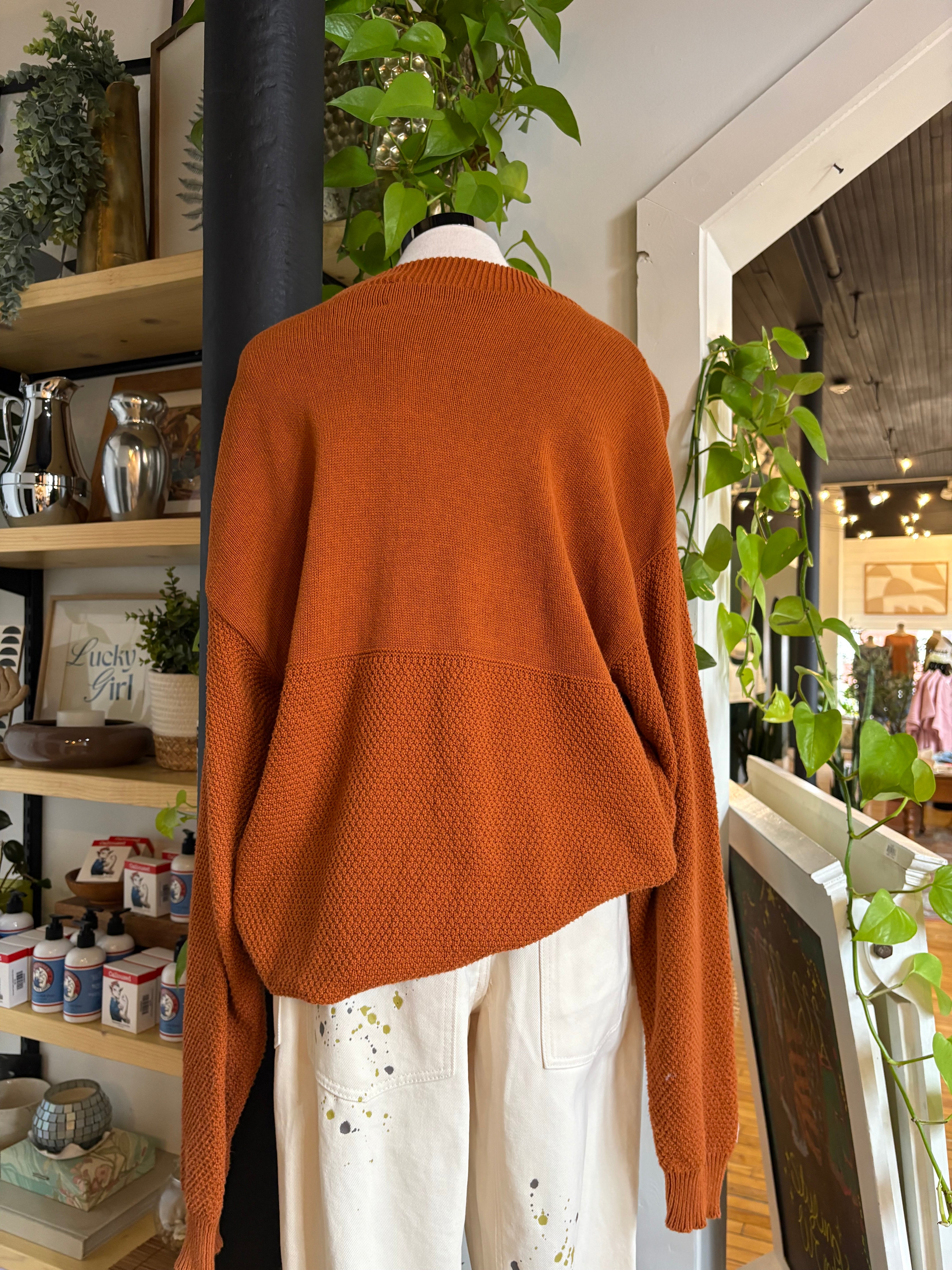 This cozy University of Texas Longhorns cropped knit pullover sweater in classic burnt orange features a relaxed oversized fit, textured knit fabric, crew neck, cropped length, and a small embroidered Longhorn steer head logo on the chest—perfect for game days or casual fan wear.