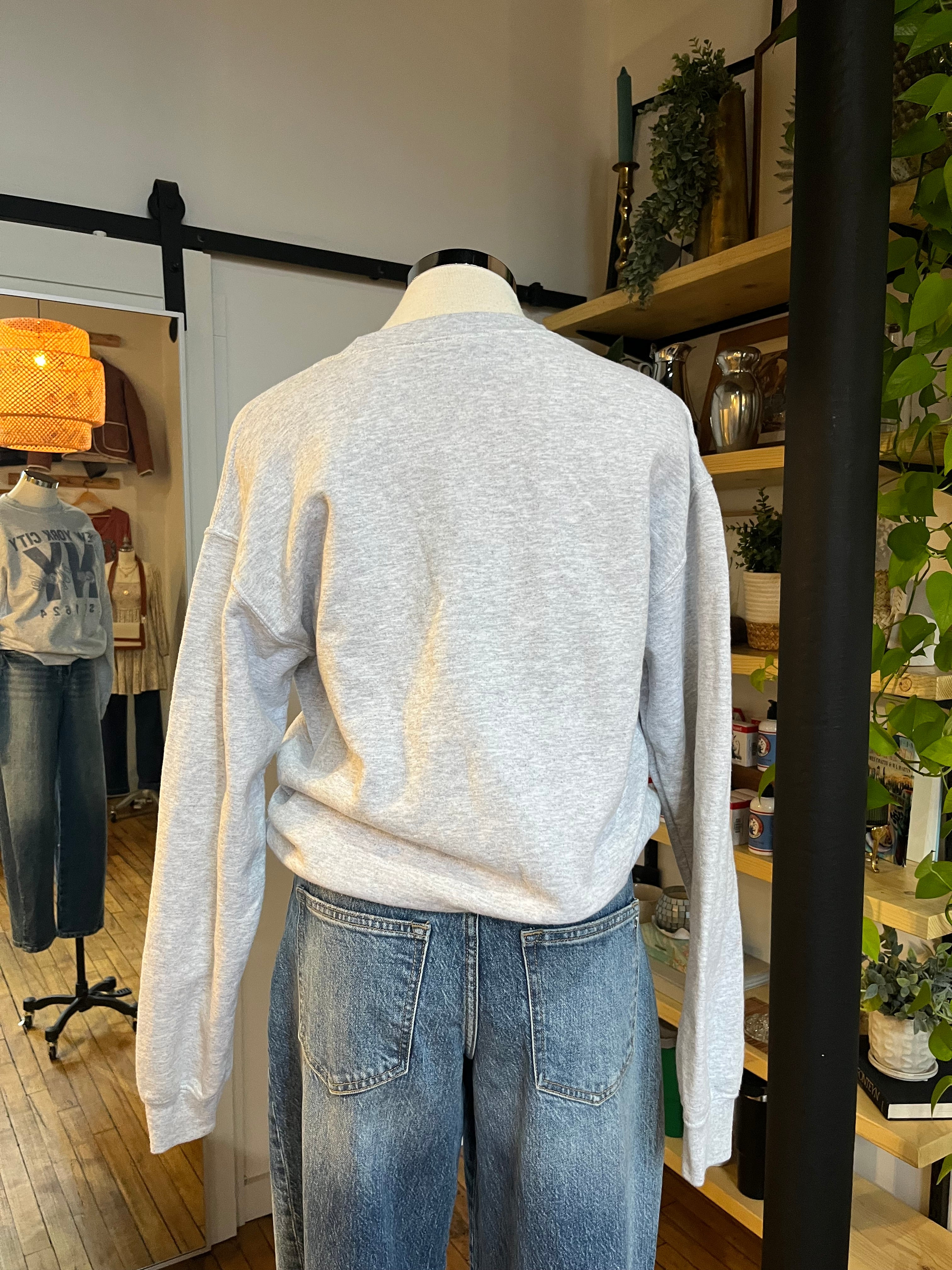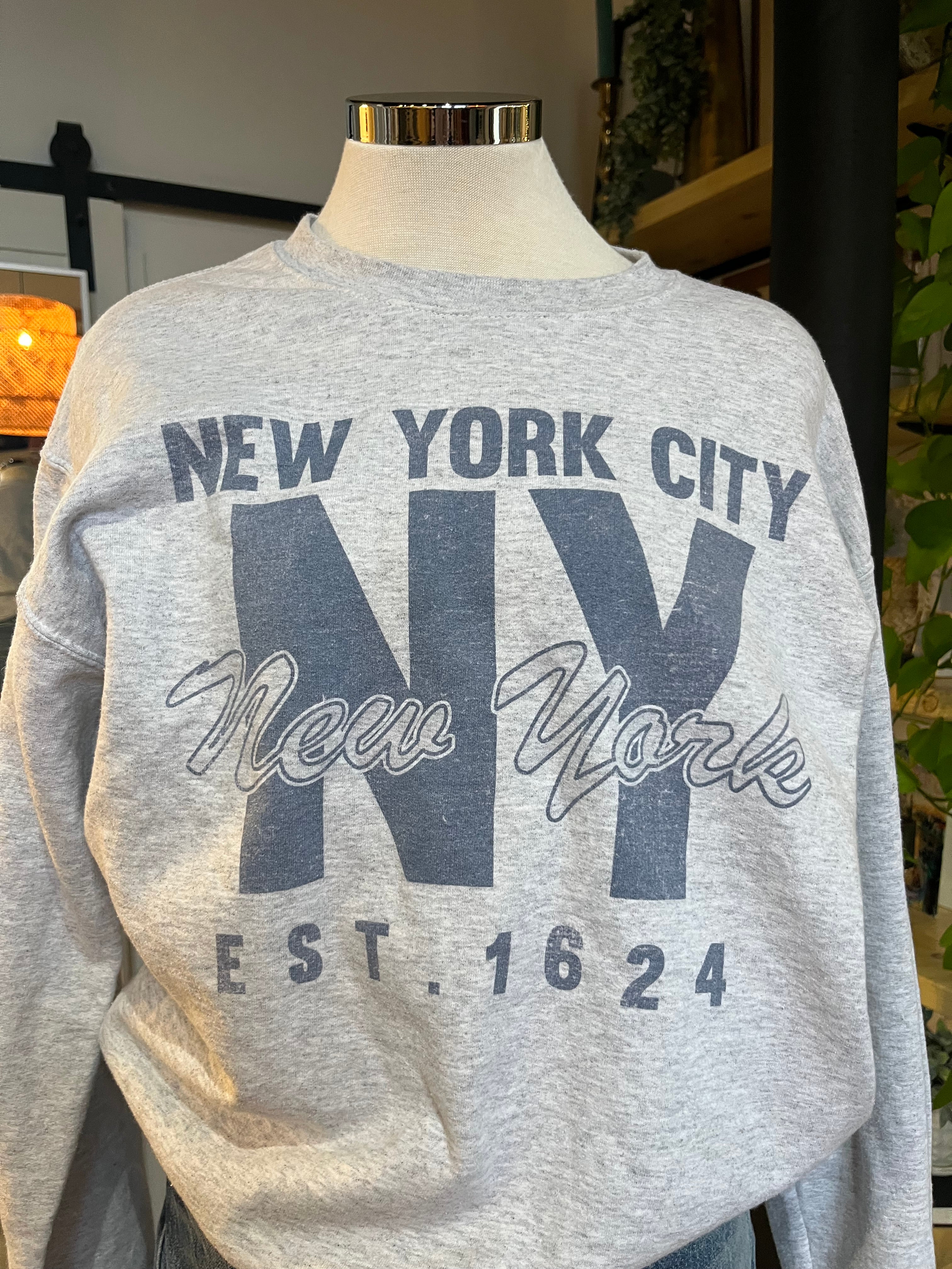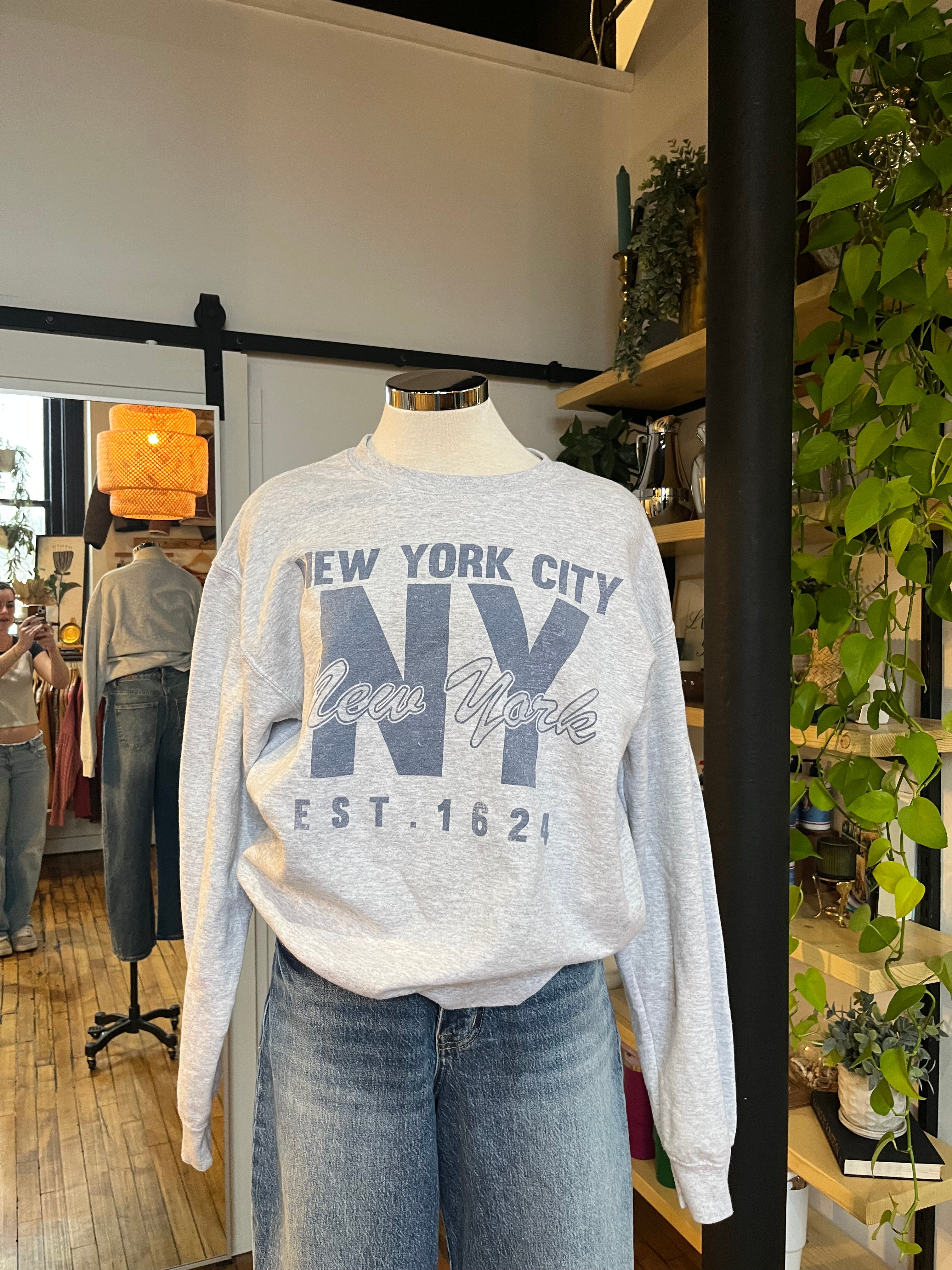 A classic grey sweatshirt featuring a bold NY graphic. Soft, relaxed, and perfect for casual days paired with denim, leggings, or biker shorts.