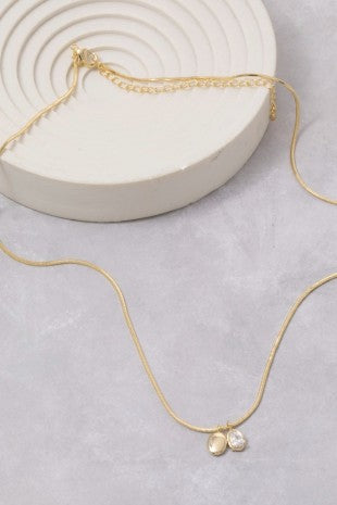 Snake chain necklace featuring a cubic zirconia charm for a simple, polished look. Measures approximately 16 inches with a 3-inch extender for adjustable length. Perfect for layering or wearing on its own.